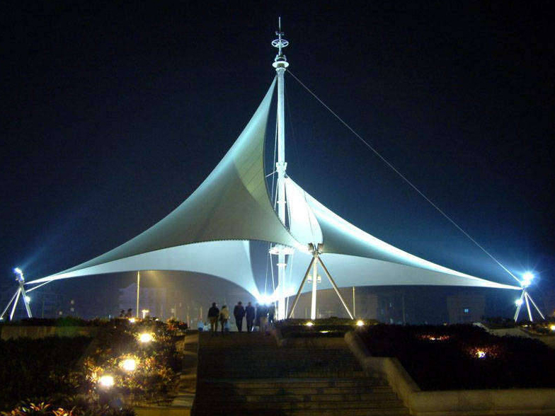景觀膜結(jié)構(gòu)又稱張拉膜景觀,主要通過膜結(jié)構(gòu)的張拉式 呈現(xiàn)出唯美的結(jié)構(gòu)特征;膜材料是指聚酯纖維基布或PVDF、PVF、PTFE等不同的表面涂層,配以優(yōu)質(zhì)的PVC組成的具有穩(wěn)定的形態(tài),并可承受一定載荷的建筑紡織品。它的壽命因不同的表面涂層而異,一般可達成10-20年;其外觀整潔大方,自潔性強。主要應用于各大公園,世博園,和一些廣場,商場等場所。