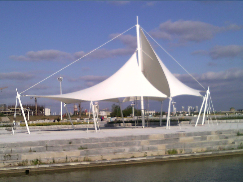 景觀膜結(jié)構(gòu)又稱張拉膜景觀,主要通過膜結(jié)構(gòu)的張拉式 呈現(xiàn)出唯美的結(jié)構(gòu)特征;膜材料是指聚酯纖維基布或PVDF、PVF、PTFE等不同的表面涂層,配以優(yōu)質(zhì)的PVC組成的具有穩(wěn)定的形態(tài),并可承受一定載荷的建筑紡織品。它的壽命因不同的表面涂層而異,一般可達(dá)成10-20年;其外觀整潔大方,自潔性強(qiáng)。主要應(yīng)用于各大公園,世博園,和一些廣場,商場等場所。