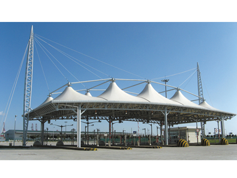 呼和浩特收費站膜結(jié)構(gòu) 出入口膜結(jié)構(gòu)是采用膜與鋼結(jié)構(gòu)的一種結(jié)合呈現(xiàn)出的新形出入口的一種新形建筑,膜材料是指聚酯纖維基布或PVDF、PVF、PTFE等不同的表面涂層,配以優(yōu)質(zhì)的PVC組成的具有穩(wěn)定的形態(tài),并可承受一定載荷的建筑紡織品。它的壽命因不同的表面涂層而異,一般可達成10-20年;其外觀整潔大方,自潔性強。主要應(yīng)用于各大出入口,收費站等場所。
